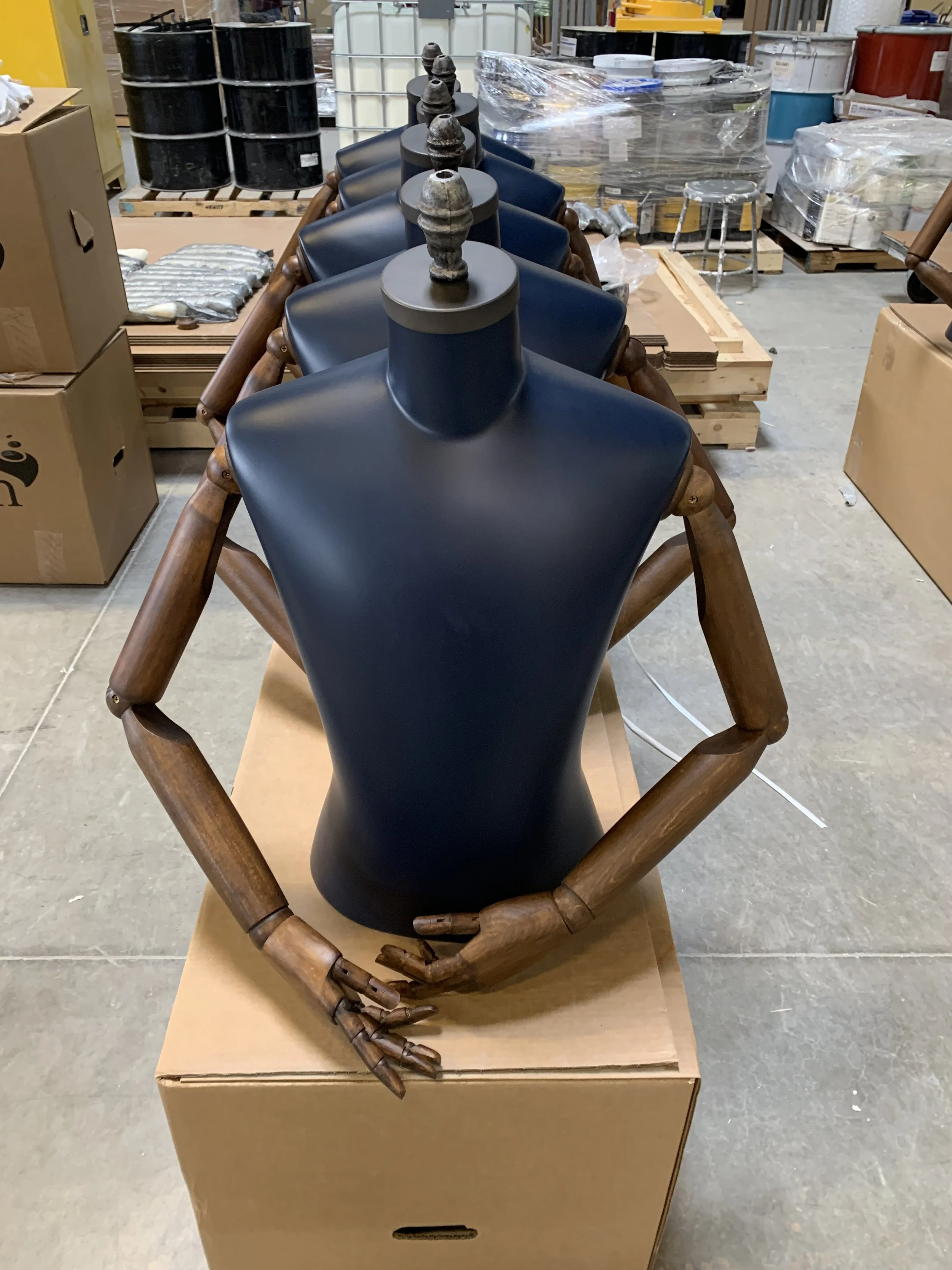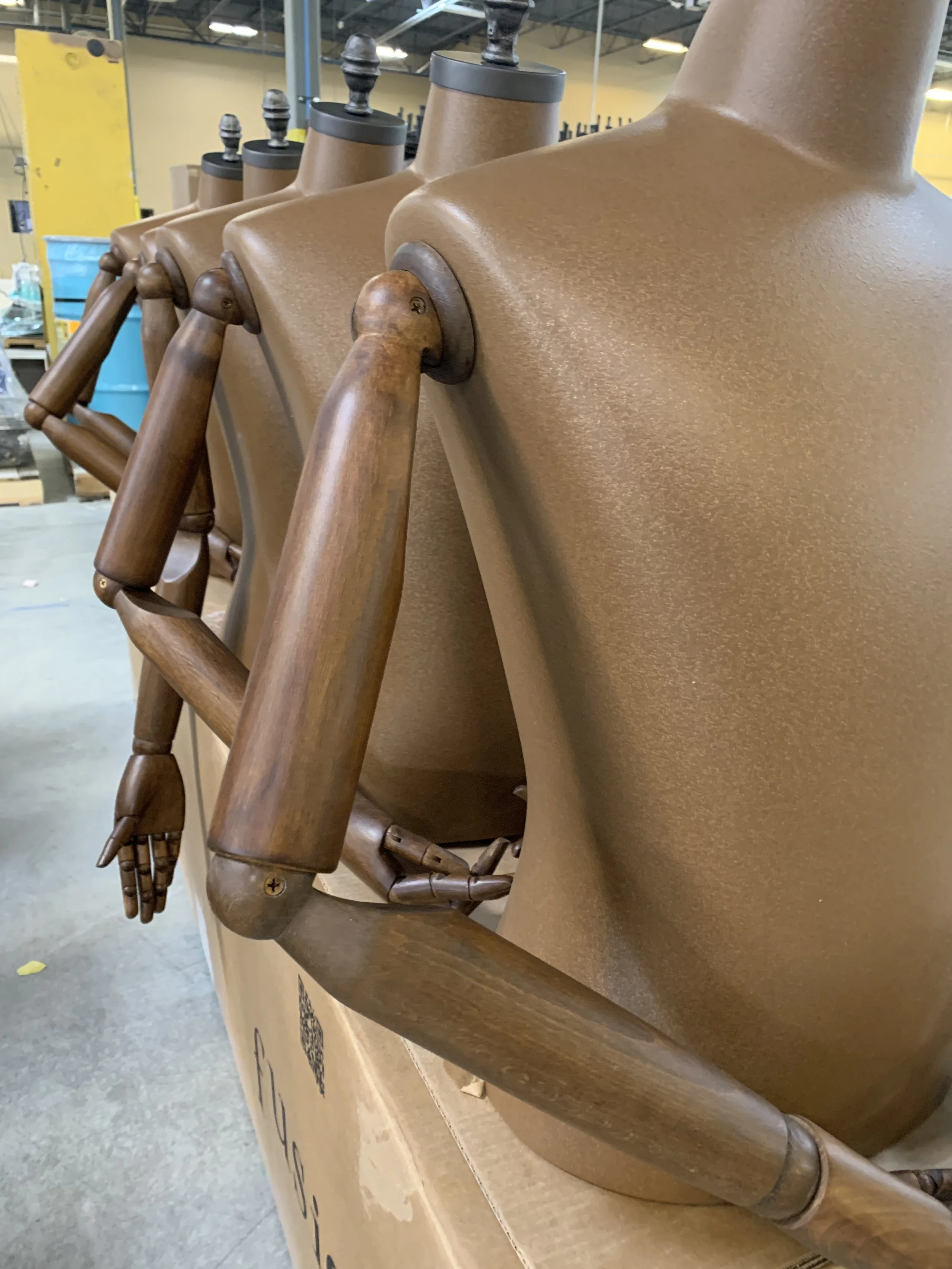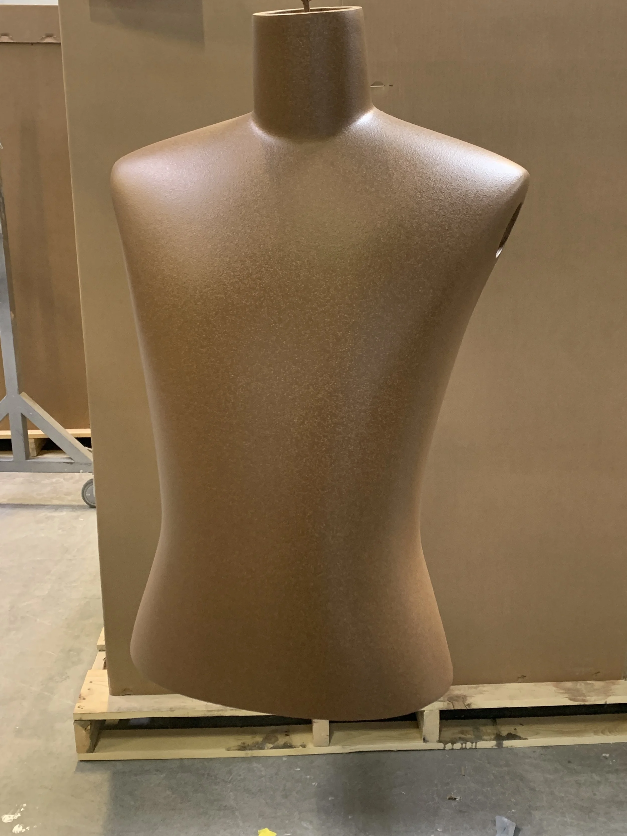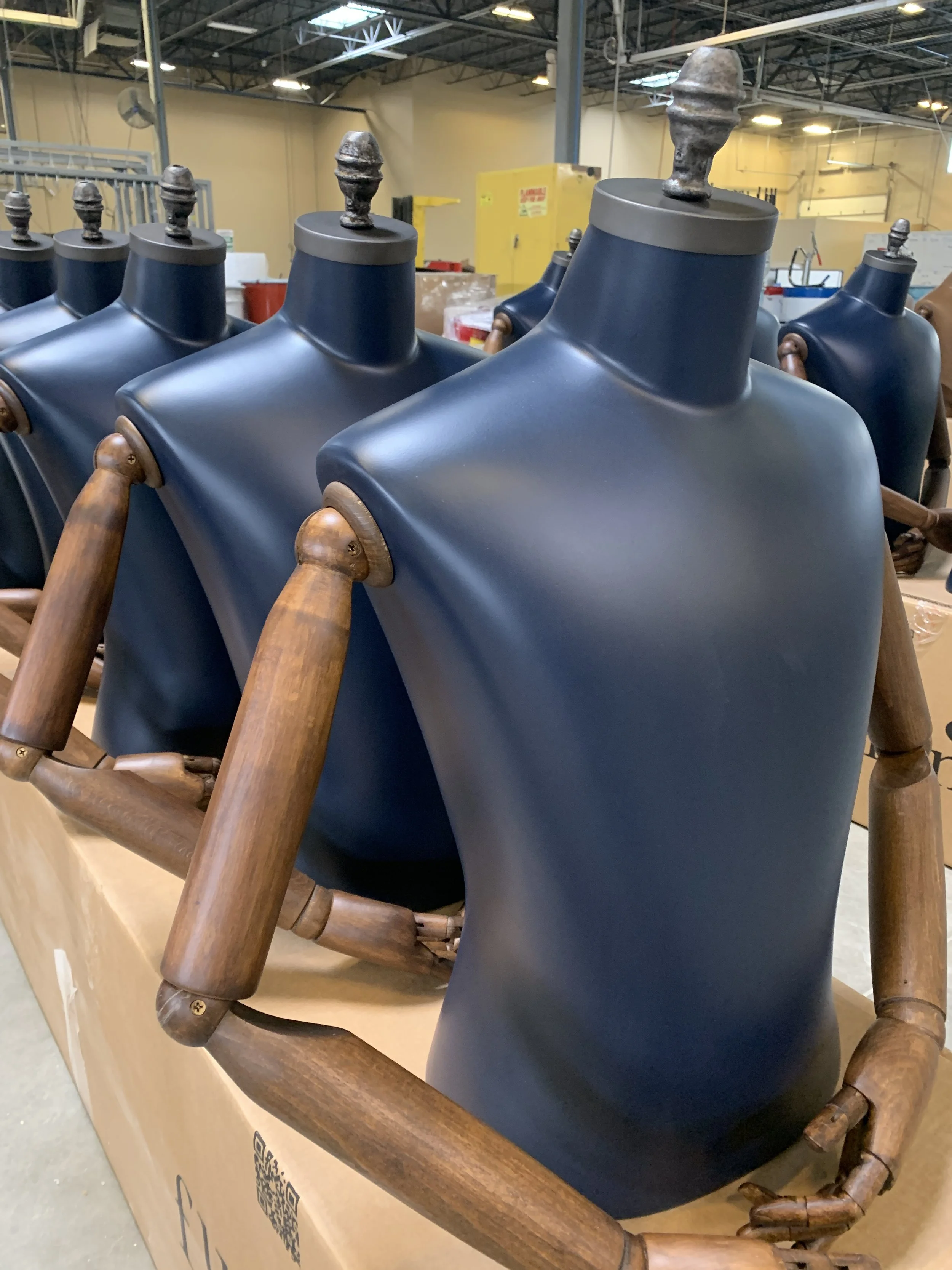 This project required a concept of leather and wood. Two bust forms were created: a navy and a leather brown. Combined with the hand-applied faux aging technique, the combination met the brief. All samples and forms were hand applied and inspected for details to mimic texture and depth. The color matching, hand applied deco, and assembly was the most cost-effective solution to meet the brief.
